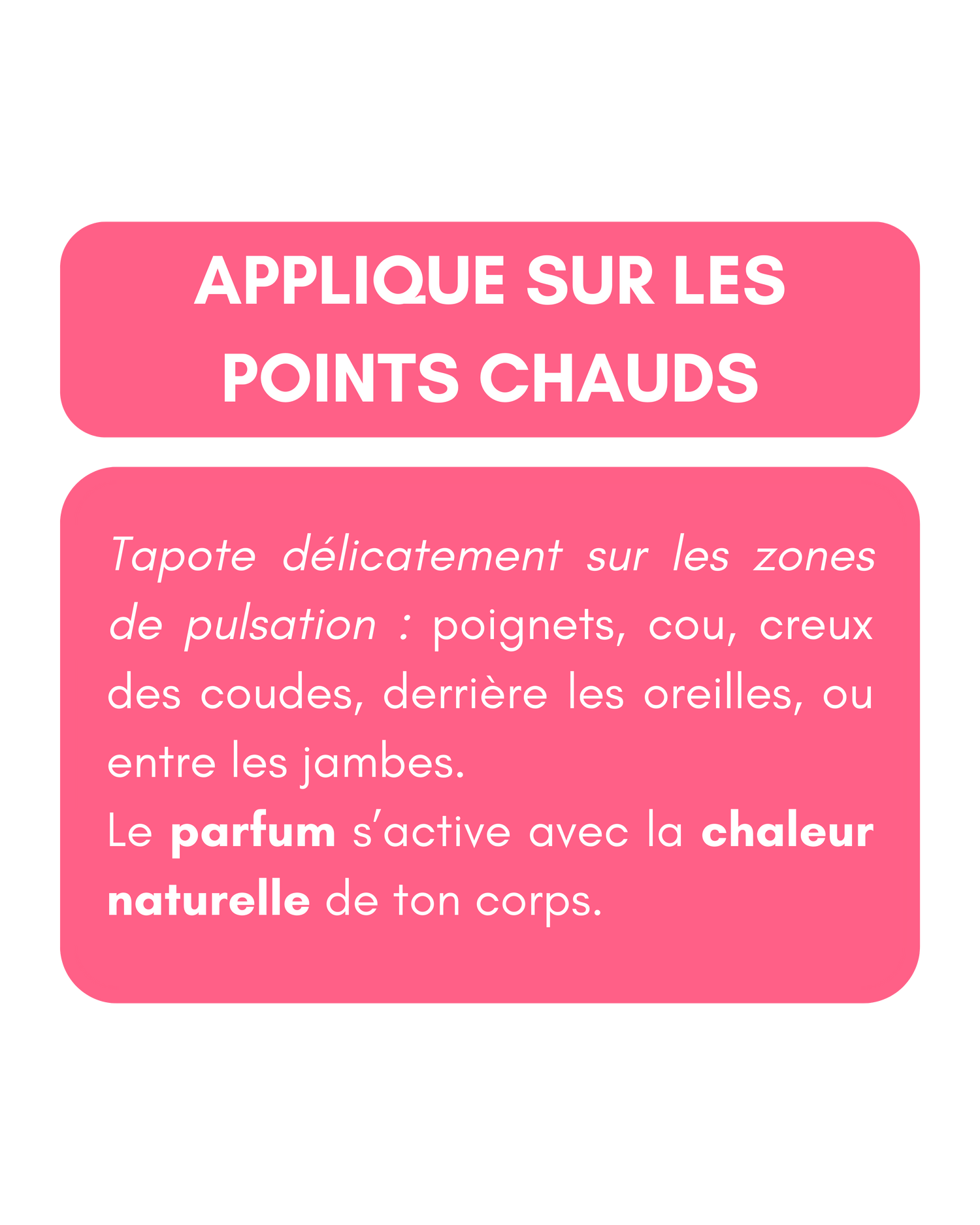 Tu peux l’appliquer aux endroits stratégiques : poignets, cou, nuque, décolleté, derrière les oreilles ou encore à l’intérieur des bras. Le musc fond au contact de la peau pour laisser un sillage doux et intime.
